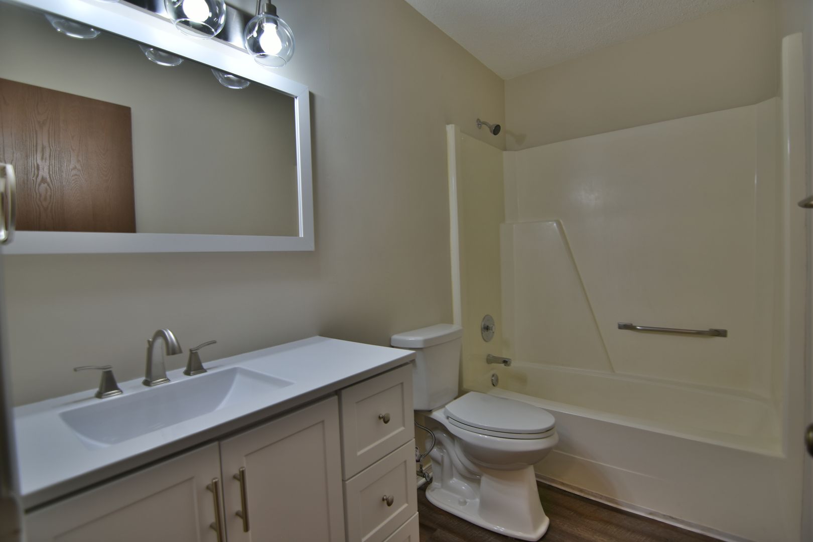 Newly remodeled with open floor plan, painted trim and new lighting. New countertops and white cabinets, Wood style plank flooring in living room, kitchen and baths and carpet in bedrooms.